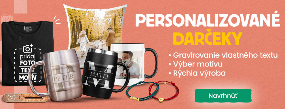 Chcete potešiť svojich blízkych originálnymi darčekmi? Našťastie pre vás máme dobrú dávku kúskov, ktoré si môžete prispôsobiť podľa svojich predstáv. Personalizované darčeky sú osobné, výnimočné a darované priamo od srdca. Priamo na našej webovej stránke si jednoducho vytvoríte vlastný návrh a my sa postaráme o zvyšok. Dokonca môžete pripojiť aj fotografie, ktoré vám radi umiestnime napríklad na tričko, hrnček, pivný poolliter, šperk alebo vankúš.