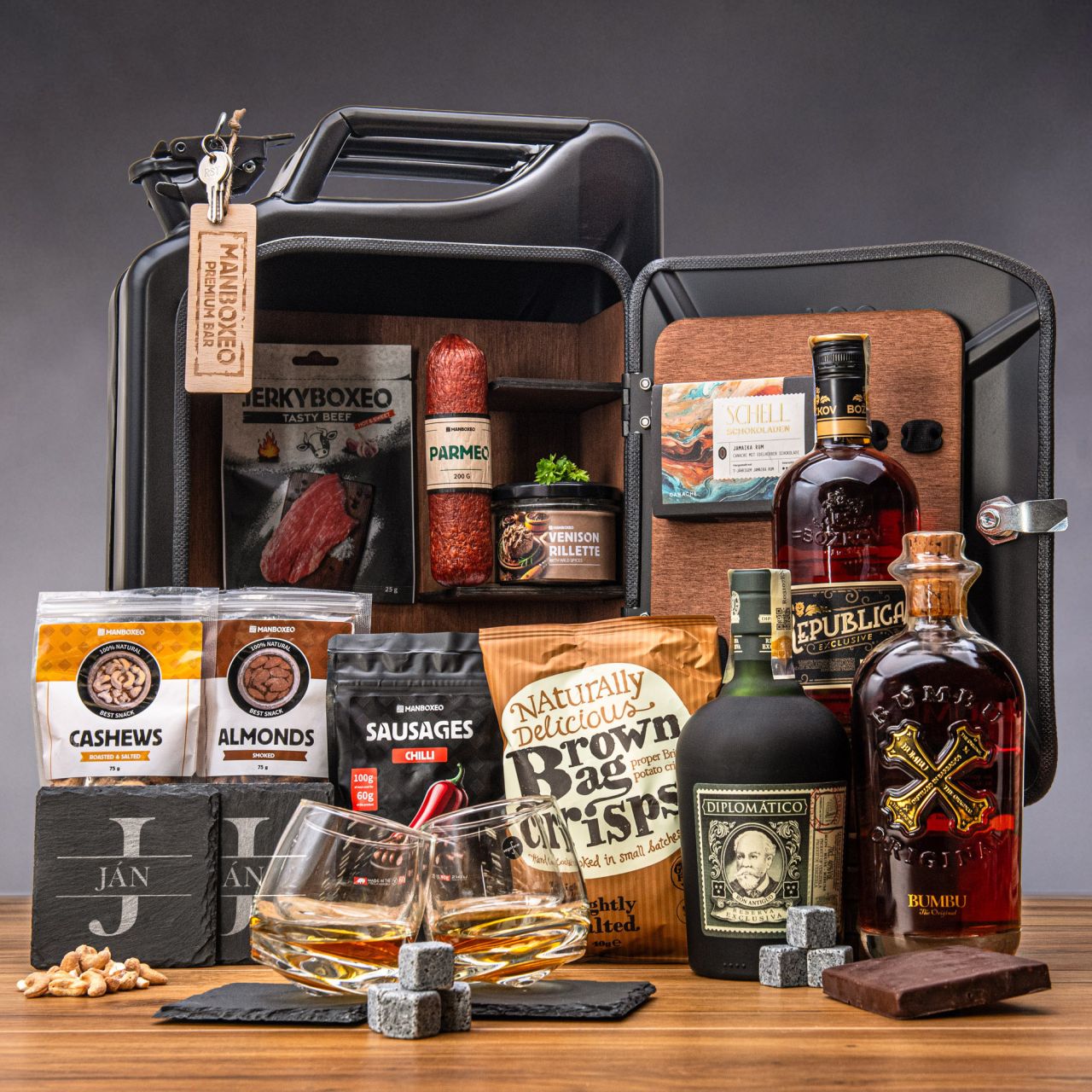 Pripite si na zdravie a šťastie oslávenca obsahom nášho kanistrového baru. Okrem fľaše kvalitného rumu vo vnútri nájdete vychytávky, vďaka ktorým bude každý panák chutiť ešte o kvapku lepšie. Navyše sme pridali aj sladké a slané dobroty, ktoré podčiarknu všetky chuťové tóny rumu. A ako dotiahnuť konzumáciu obsahu k dokonalosti? Dobrou spoločnosťou!