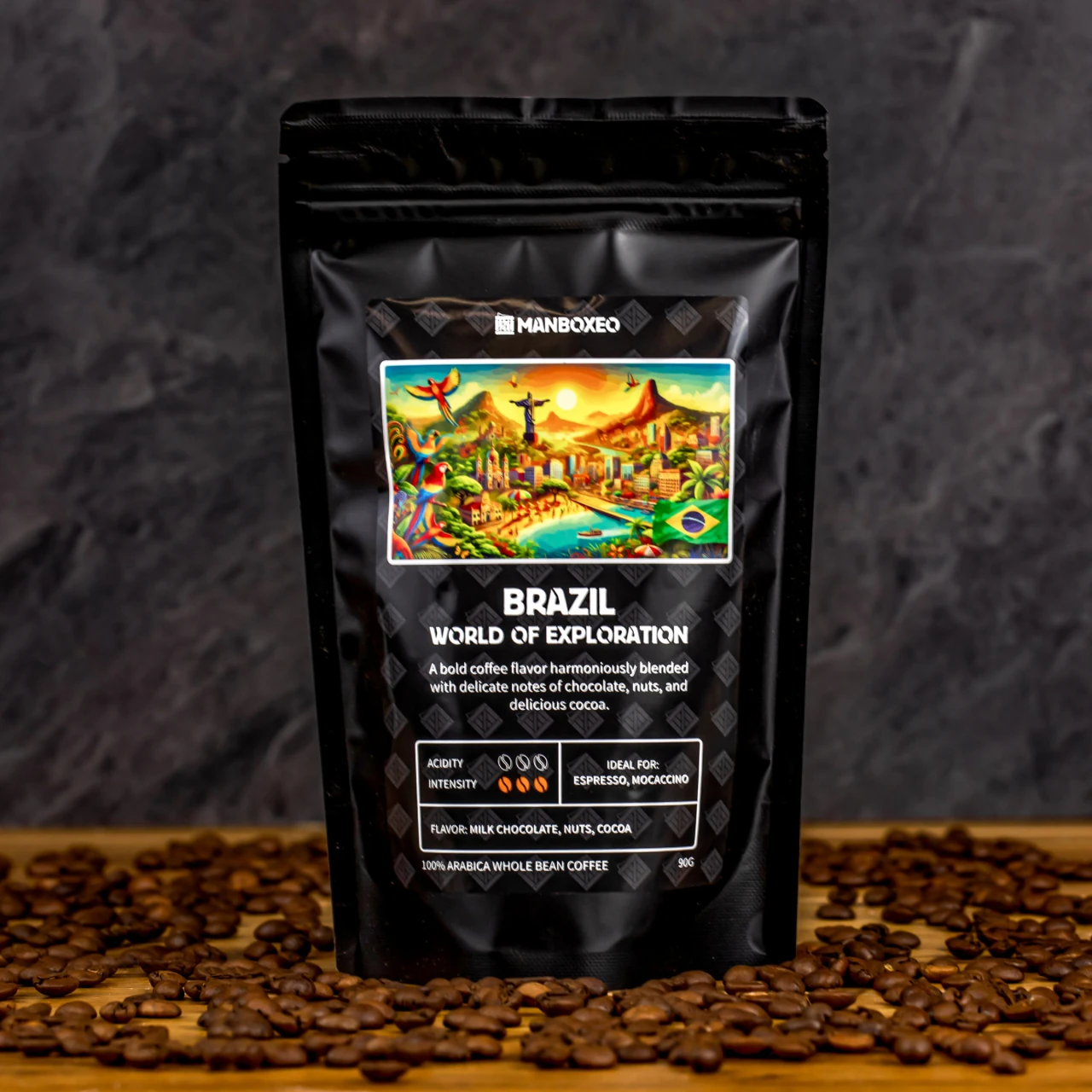Brazilská káva 100% Arabica, zrnková káva s výraznou čokoládovou chuťou, ktorá je doplnená jemnou chuťou orechov a kakaa. Vysoká intenzita, nízka kyslosť. Ideálna na prípravu espressa a moka kávy. Hmotnosť: 90 g.