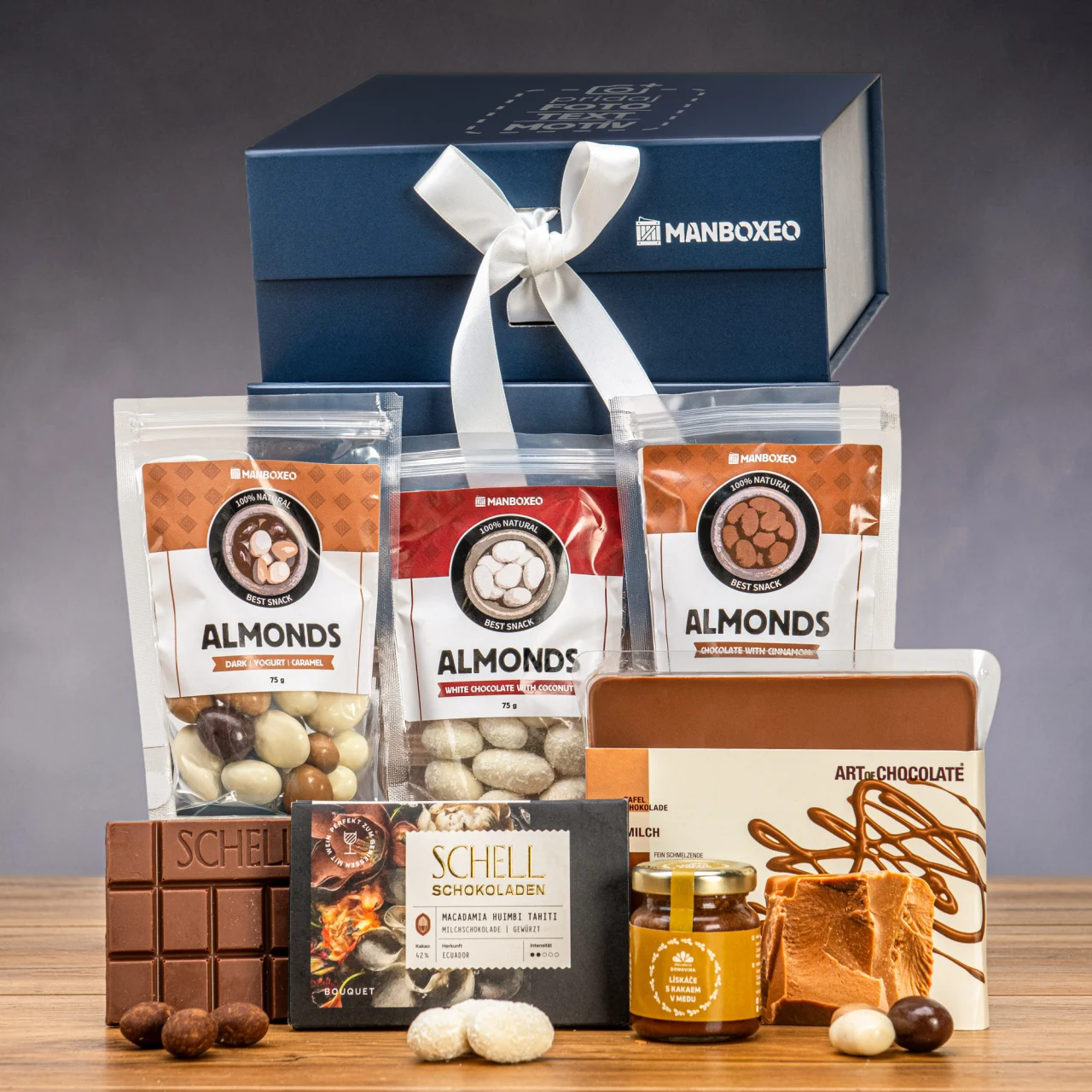 Akonáhle sa oslávenec dostane dnu, nebude vedieť, čo skôr ochutnať. A niet sa čomu čudovať! Celý box sme naplnili až po okraj čokoládovými špecialitami! Vybrali sme tú najlepšiu čokoládu v rôznych podobách – tabuľky, máčané orechy, pralinky. Plán je jasný: všetko ochutnať, poriadne si zamaškrtiť a potešiť chuťové aj nervové bunky.