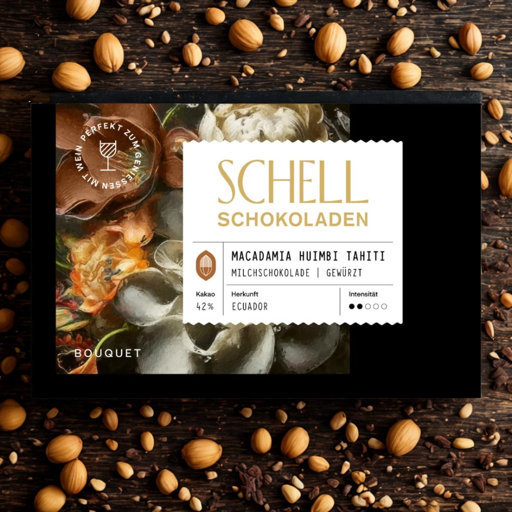 Mliečna čokoláda s makadamovými orechmi 50g — Tak toto ste ešte nejedli! Delikátna mliečna čokoláda vyrobená zo vzácneho ekvádorského kakaa sa spojila s praženými makadamovými orechmi a tahitskou vanilkou s korenistými tónmi. Tento skvost sa skvele hodí k vínu, jemnému rumu či slivovici.