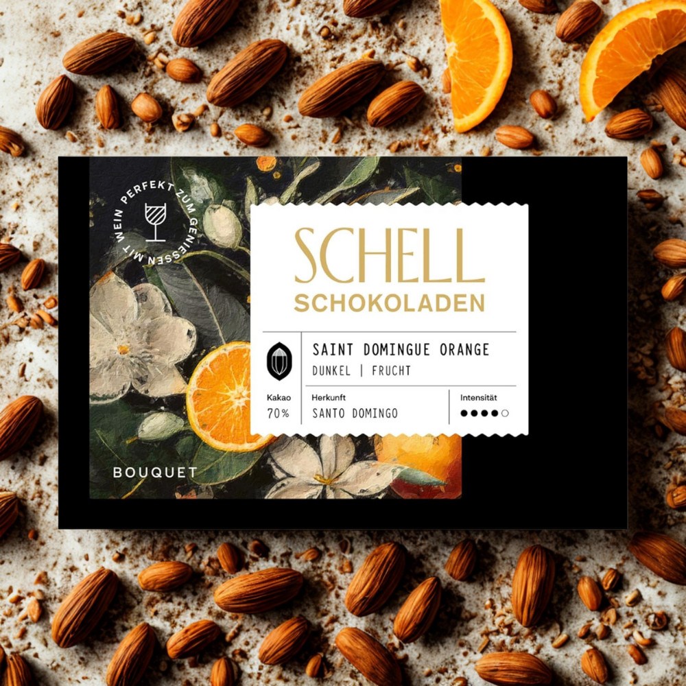 Horká čokoláda Schell Saint Domingue Orange 50g — Malá tabuľka nabitá chuťou. Horká 70 % čokoláda vyrobená z kakaa z Dominikánskej republiky je dochutená sladkou pomarančovou kôrou. Vhodná pre vegánov a ideálna pre všetkých milovníkov kvalitných sladkostí.