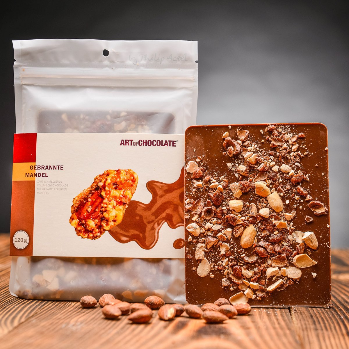 Čokoládová tabuľa s pečenými mandľami 120g — Absolútne nebo pre milovníkov orieškových čokolád. Tabuľa je z jednej strany bohato posypaná chrumkavými, dokonale upraženými mandľami. Zbiehajú sa vám sliny?