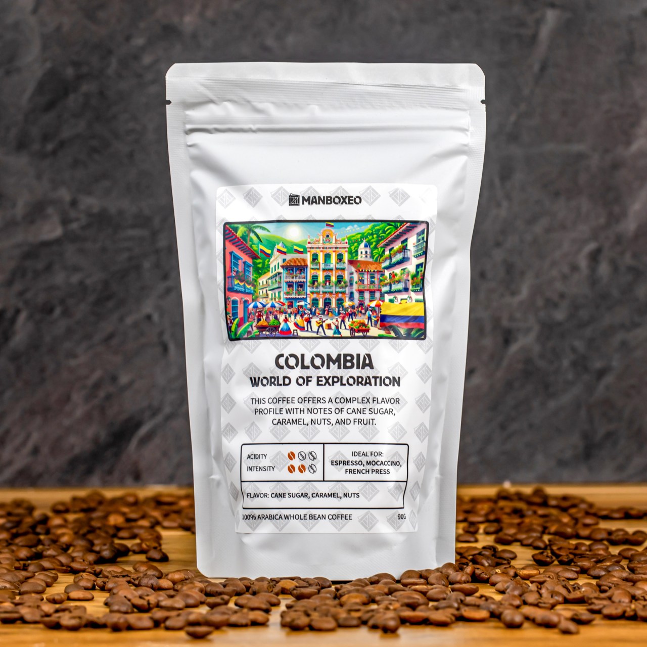 Kolumbia (90 g) – 100 % ARABICA – Zrnová káva s komplexnou chuťou s tónmi karamelu a šťavnatého červeného jablka. Vysoká intenzita, nízka acidita. Ideálna na espresso a moka.