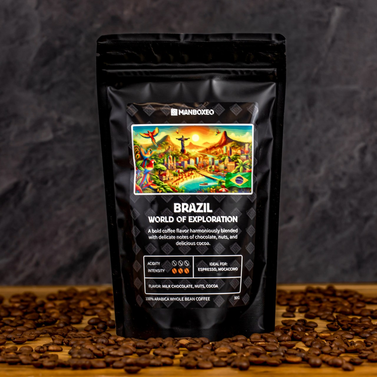 Brazília (90 g) – 100 % ARABICA – Zrnová káva s výraznou čokoládovou chuťou, ktorú dopĺňa jemná príchuť orechov a kakaa. Vysoká intenzita, nízka acidita. Ideálna na espresso a moka.