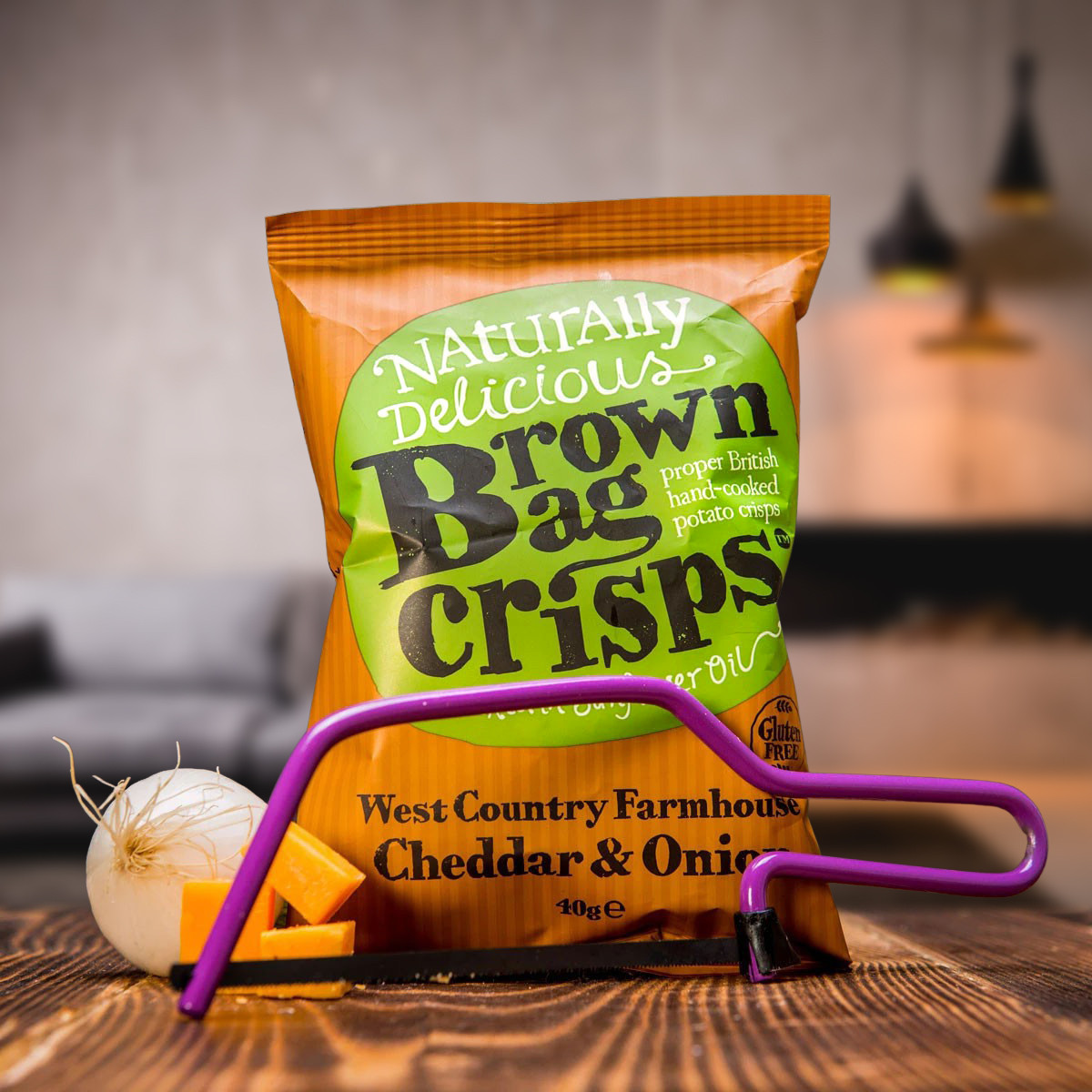 Zemiakové lupienky Brown Bag Crisps – čedar a cibuľa 40g – Láska na prvé ochutnanie – presne to vystihuje túto kvalitnú a výnimočnú pochúťku. Spojenie čedaru a cibule vás dostane už po prvom kúsku. Bez lepku, vhodné aj pre vegánov.