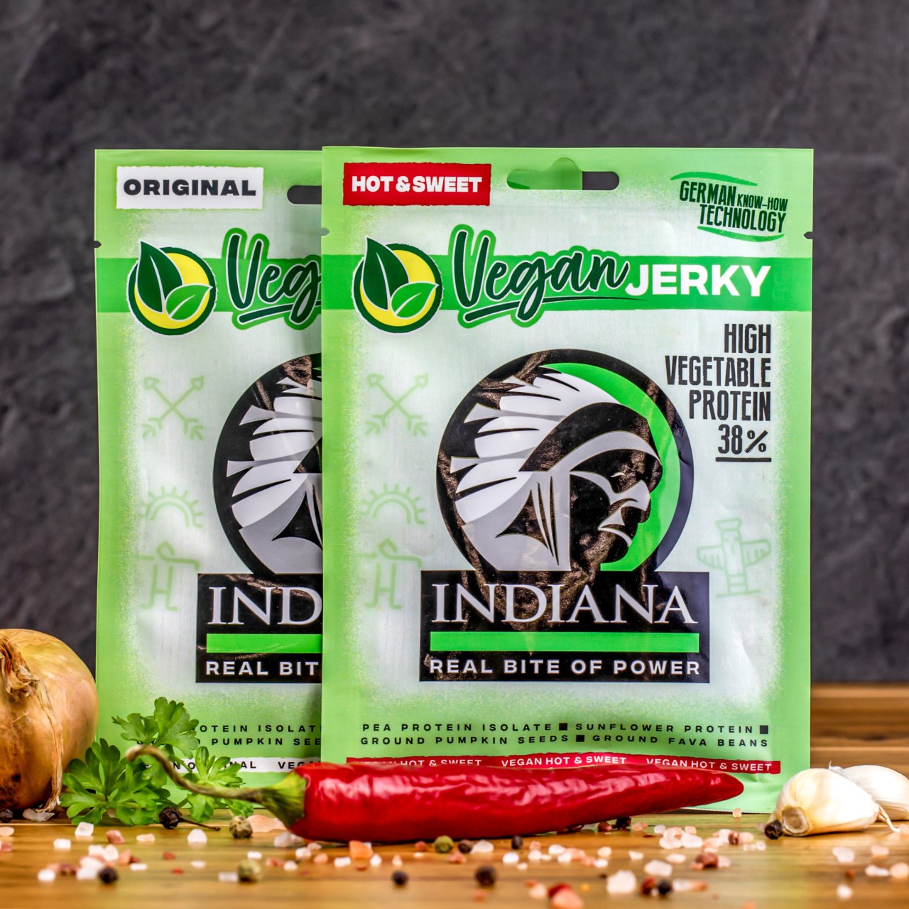 2x Vegan Jerky Hot&Sweet 25 g Indiana – Mäsu nefandíš, ale nejaká alternatíva sušeného mäsa by ti bodla? Vyskúšaj našu vegánsku variantu. Vďaka praktickému baleniu je to dokonalá maškrta do vrecka.