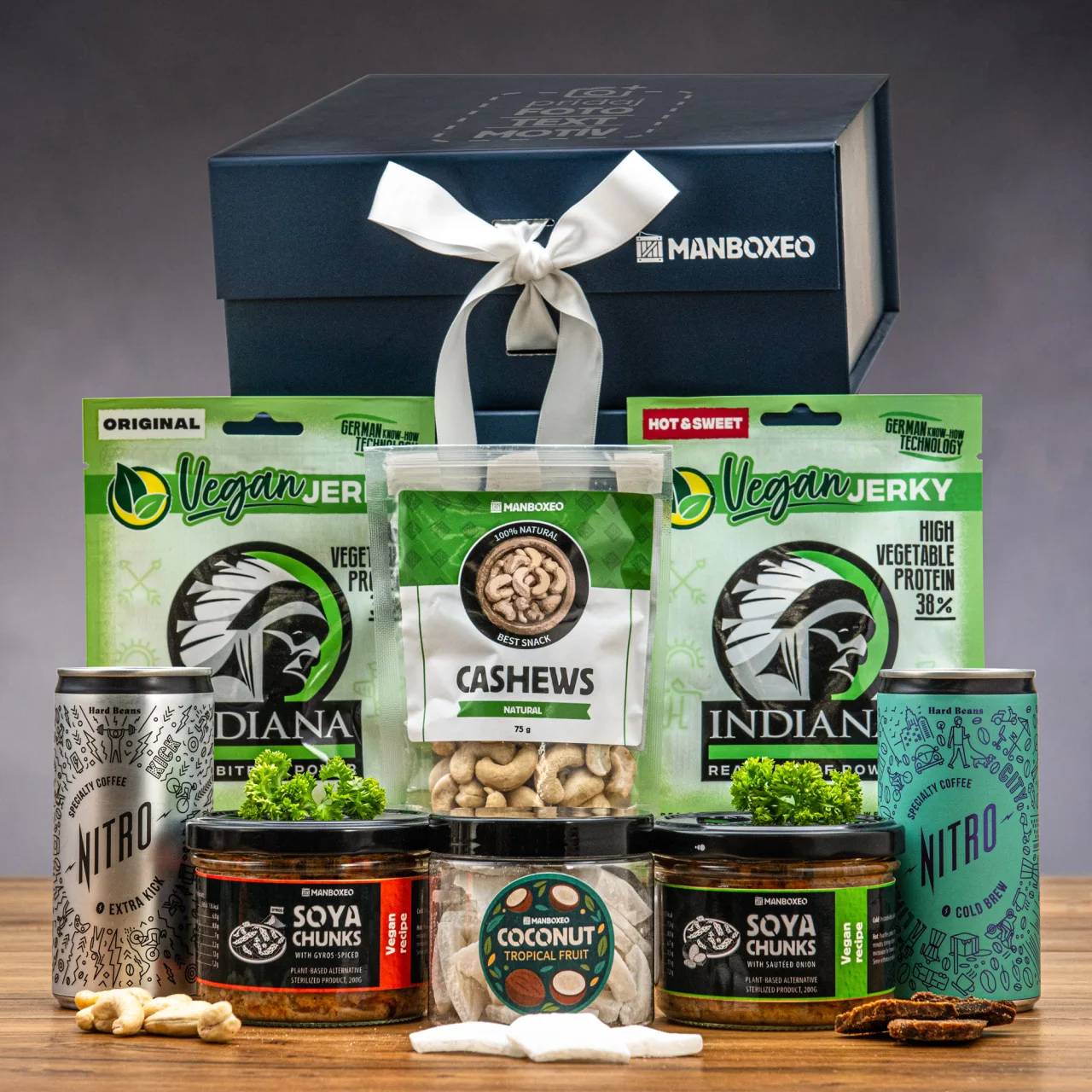 Čo v sebe táto nenápadná krabička ukrýva? Veľké veci! Obdarovaný sa môže tešiť na vegánske špeciality, ktoré okúzlia všetky jeho zmysly. Najrôznejšie maškrty, prémiová kávička – a tým to ani zďaleka nekončí. Toto jednoducho musíš zažiť na vlastnej koži… alebo skôr zmyslami?