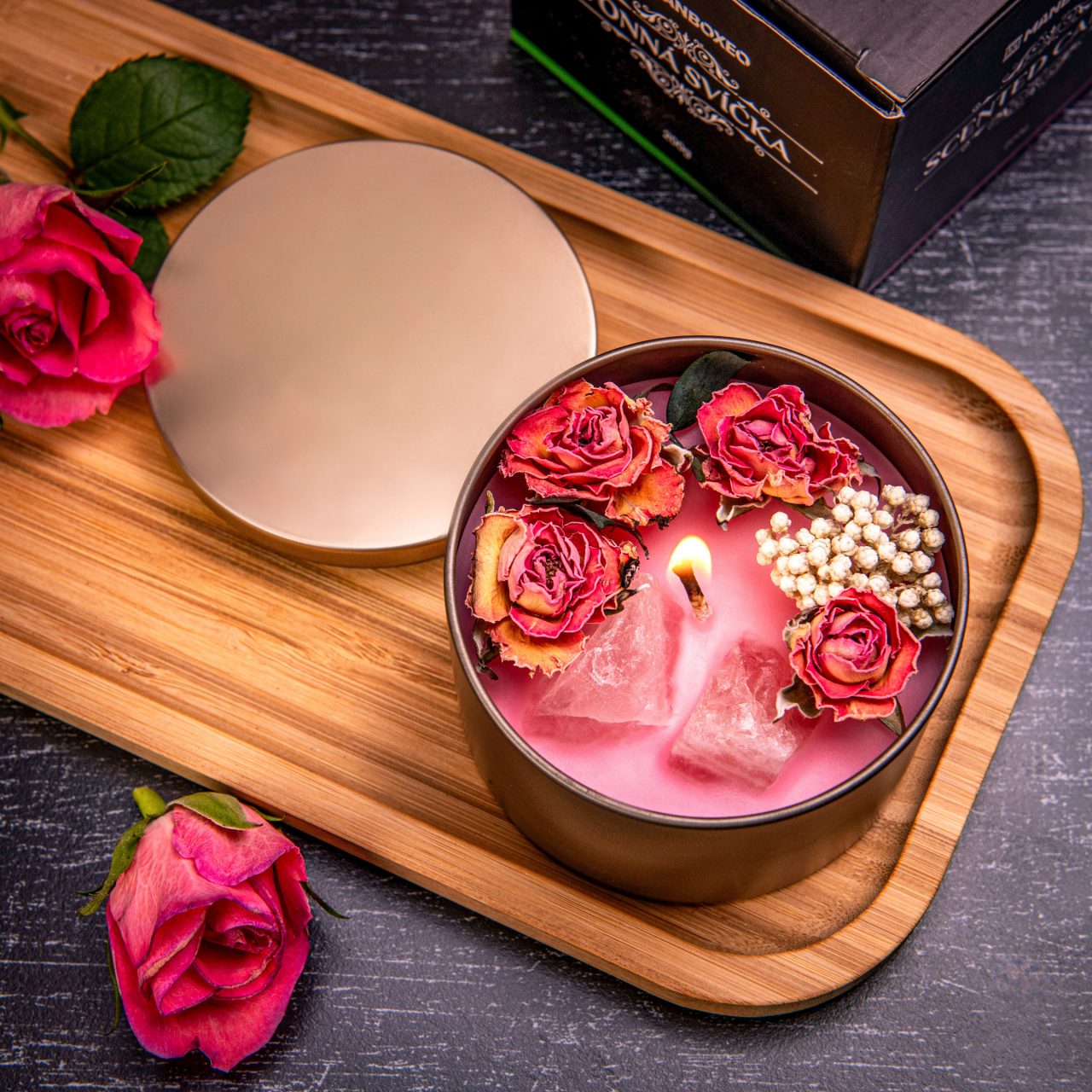 Plechová VONNÁ SVIEČKA v krabičke 200g – ROSE – Táto sviečka je 2v1. Rozžiari domov príjemným svetlom, naplní ho vôňou ruží a ozdobí interiér sušenými kvetmi a kamienkami, ktoré sa pri horení krásne trblietajú.