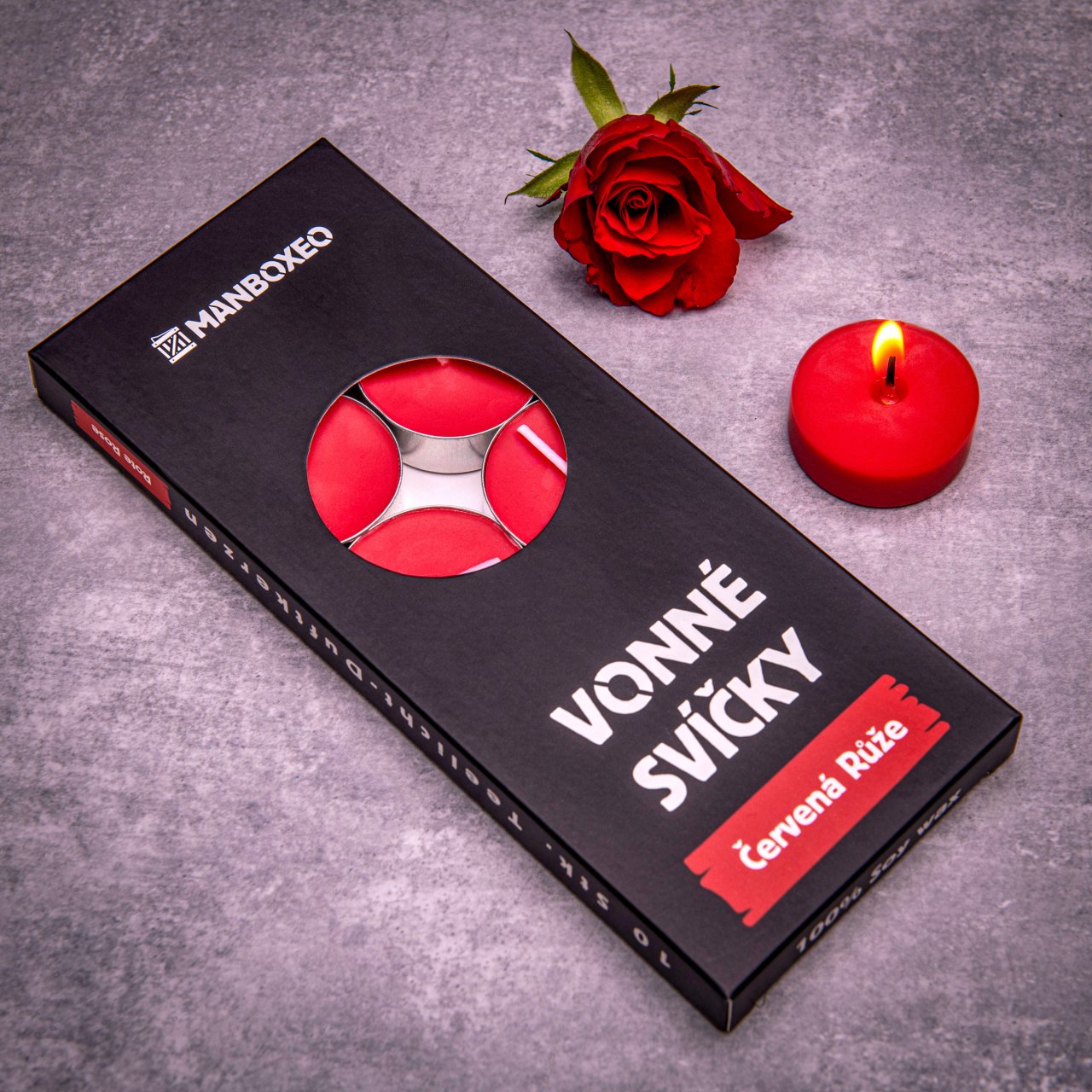 Červenočierne VONNÉ SVIEČKY 10ks – ČERVENÁ RUŽA – 1 krabička, 10 dôvodov na radosť. Ručne robené sójové čajové sviečky s intenzívnou vôňou ruží z prírodných esenciálnych olejov. Ideálny darček na sviatok, narodeniny aj Vianoce.