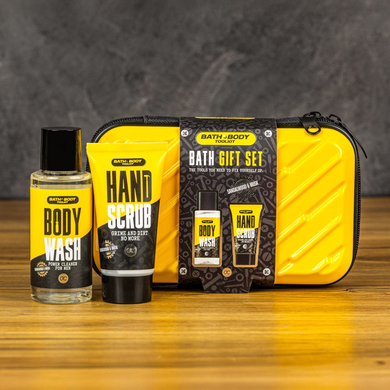 Kúpeľový SET BATH and BODY TOOLKIT — Nosíť do dielne či na cesty celú kúpeľňu sa nechce žiadnemu chlapovi. S naším cestovným setom si úplne vystačí. Sada obsahuje sprchový gél a peeling na obzvlášť znečistené ruky.