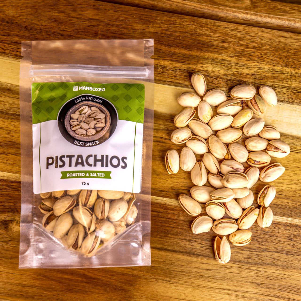 Pistácie pražené & solené 75 g — Prvotriedne pistácie, správne chrumkavé a plné chuti. Ich kvalita a chuť pokorí bežné oriešky z obchodu.