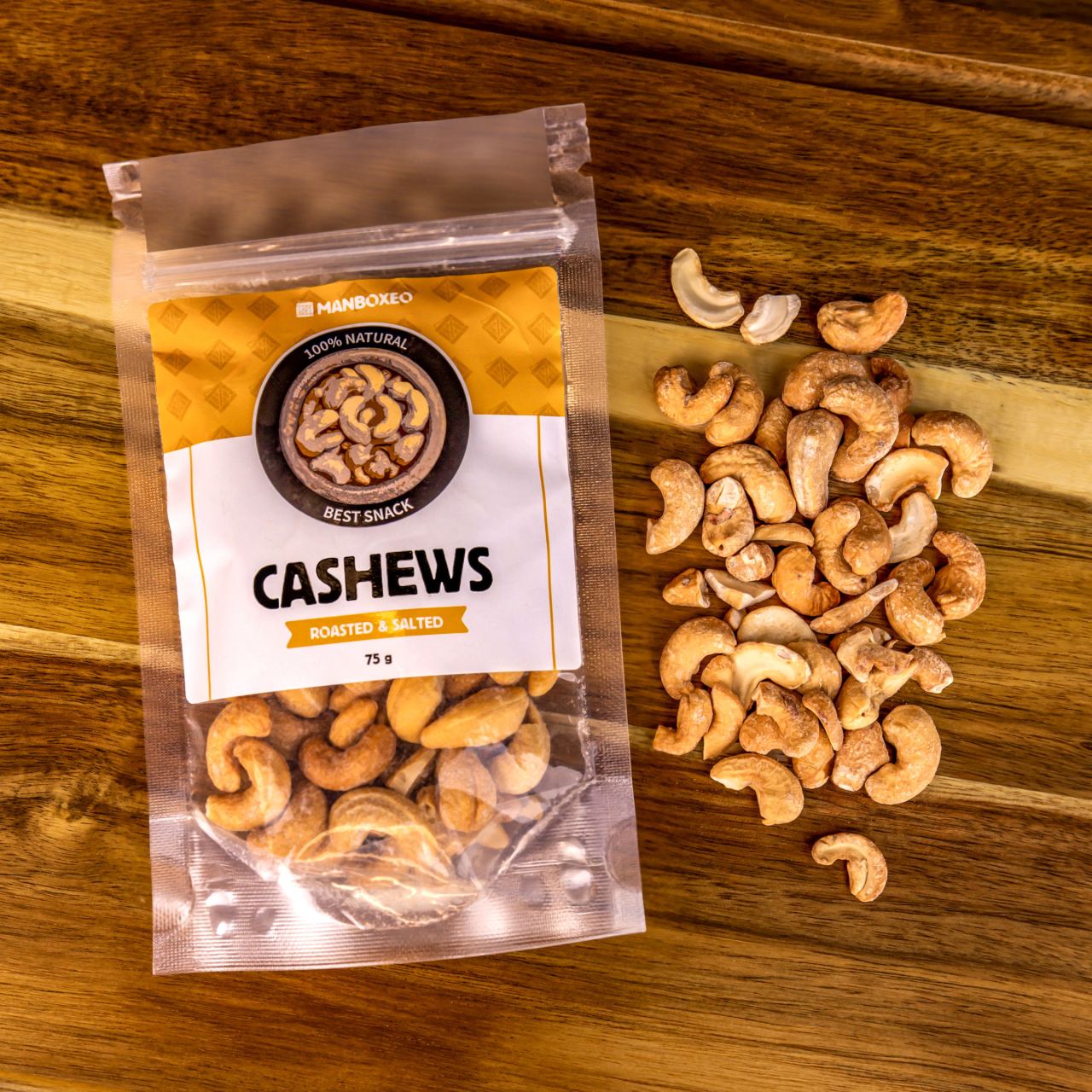 Kešu pražené & solené 75 g — Varovanie: kto raz ochutná tieto prémiové pražené a solené kešu, nebude chcieť žiadne iné. Kvalita je badateľná na prvý kus.