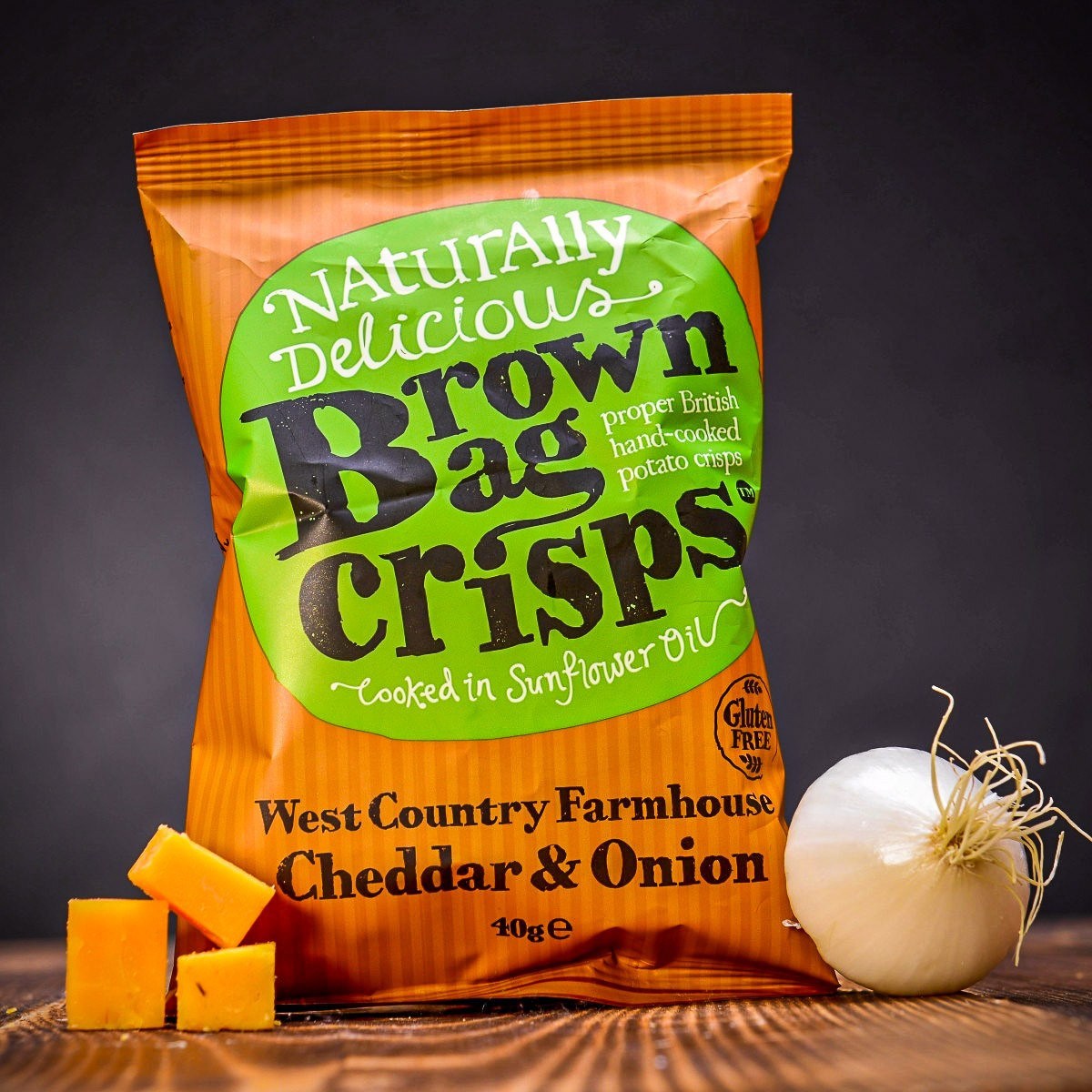 Zemiakové lupienky Brown Bag Crisps – cheddar a cibula 40 g — Vieme, že jeden balíček nebude stačiť! Kombinácia cheddaroveho syra a sladkej cibule je jednoducho dokonalá. Ochutnajte!