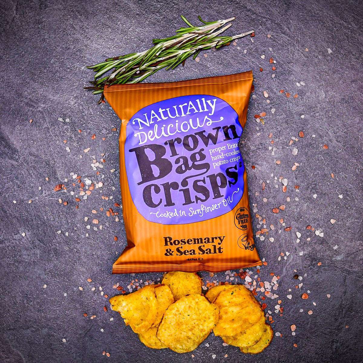 Zemiakové lupienky Brown Bag Crisps — rozmarín a morská soľ 40 g — Totálna chuťová bomba. Ručne vyrábané chipsy doladené v Anglicku do dokonalosti príchute rozmarínu a morskej soli. Všetky ingrediencie sú 100 % prírodné a ich súhra je nezabudnuteľná.