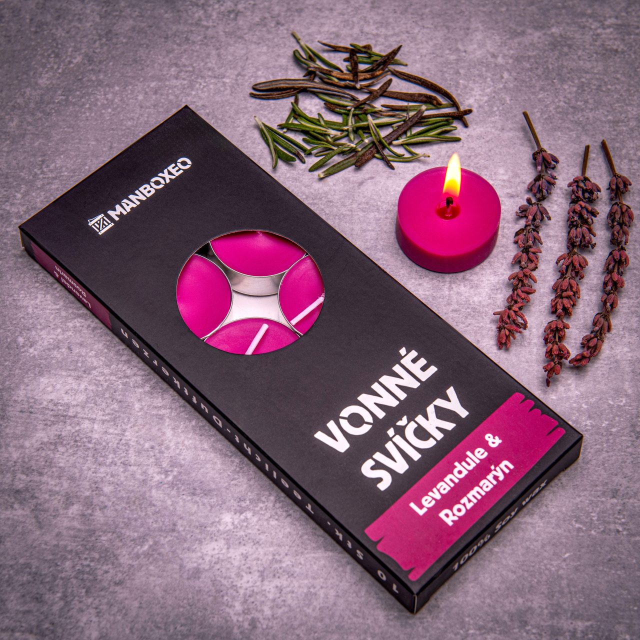 Fialovočierne VONNÉ SVIEČKY 10 ks — LEVANDUĽA & ROZMARÍN — Kvapka levandule, štipka rozmarínu a kvalitný sójový vosk. Z tejto kombinácie nemôže vzniknúť nič zlé — len príjemná vôňa a krásna atmosféra.