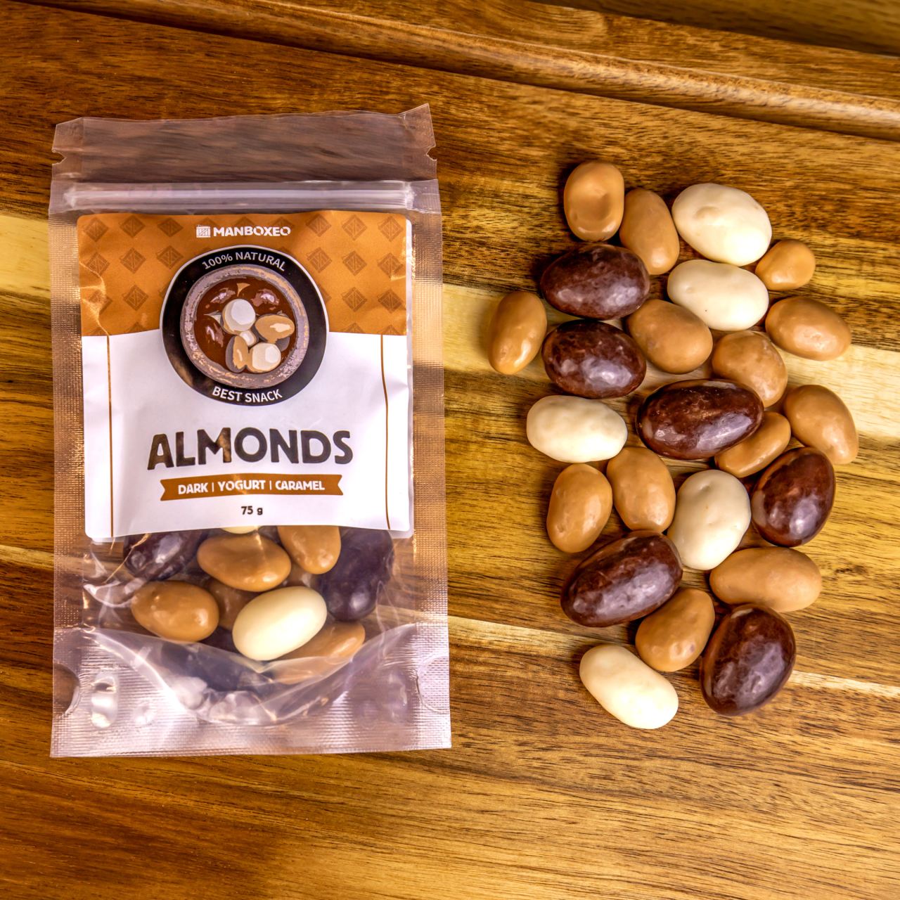 Čokoládové Mandle Karamel & Hořká & jogurt 75 g – Horká, mliečna a biela čokoláda. To sú tri chuťovo dokonalé polevy, v ktorých sú ukryté lahodné mandličky. Ochutnajte a oddajte sa tejto úžasnej kombinácii chutí.