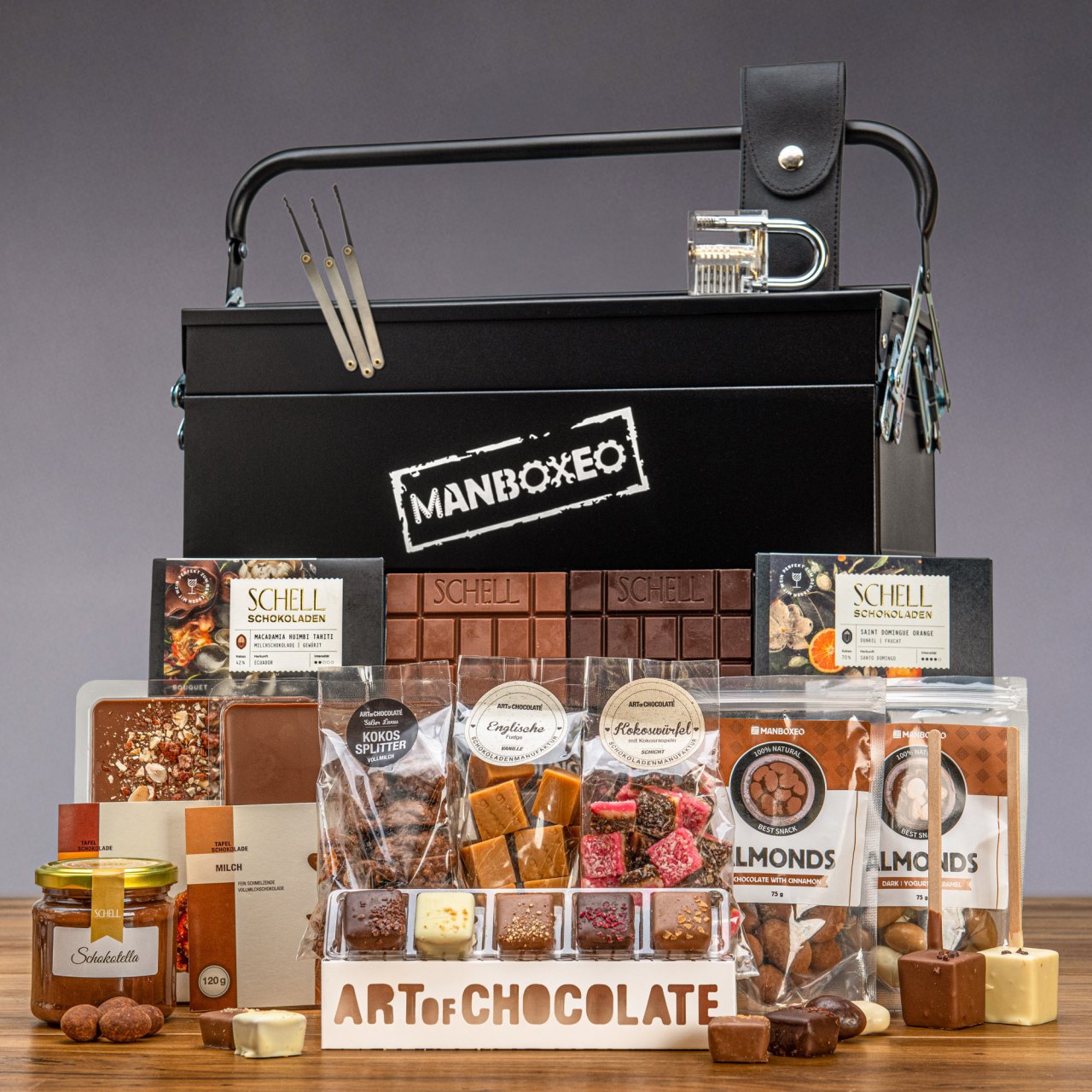 Mysleli ste si, že v tomto plechovom kufríku sa skrýva len náradie? Omyl, dámy a páni. Naplnili sme ho totiž až po okraj čokoládovými špecialitami! Vybrali sme tú najlepšiu čokoládu v rôznych podobách – tabuľky, máčané oriešky, pralinky. Plán je jasný: všetko ochutnať, poriadne si zamaškrtiť a potešiť chuťové aj nervové bunky. Ďalším prekvapením, ktoré jednoducho vložíte do kufríka, je multifunkčný nástroj, ktorý vám na želanie označíme menom oslávenca.