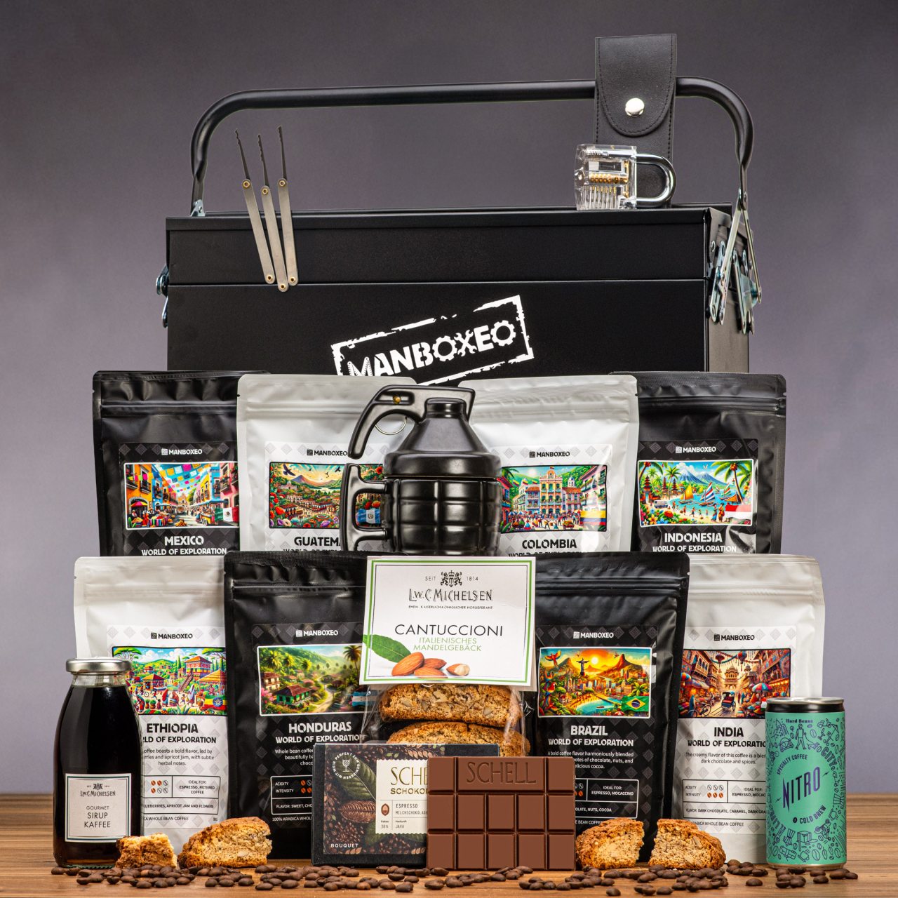 Mysleli ste si, že sa v tomto kufríku ukrýva len náradie? Omyl, dámy a páni. Kufor sme naplnili až po okraj výberovou kávou, kávovými špecialitami a sladkosťami, ktoré sa k tomuto božskému nápoju skvele hodia. Obsah zabezpečí obdarovanému chvíle pohody, alebo ho nakopne, keď bude potrebovať extra dávku kvalitného kofeínu a cukru. Hotová slasť! Ďalším prekvapením, ktoré môžete do kufríka jednoducho pridať, je multifunkčný nástroj, ktorý vám na želanie personalizujeme menom oslávenca.