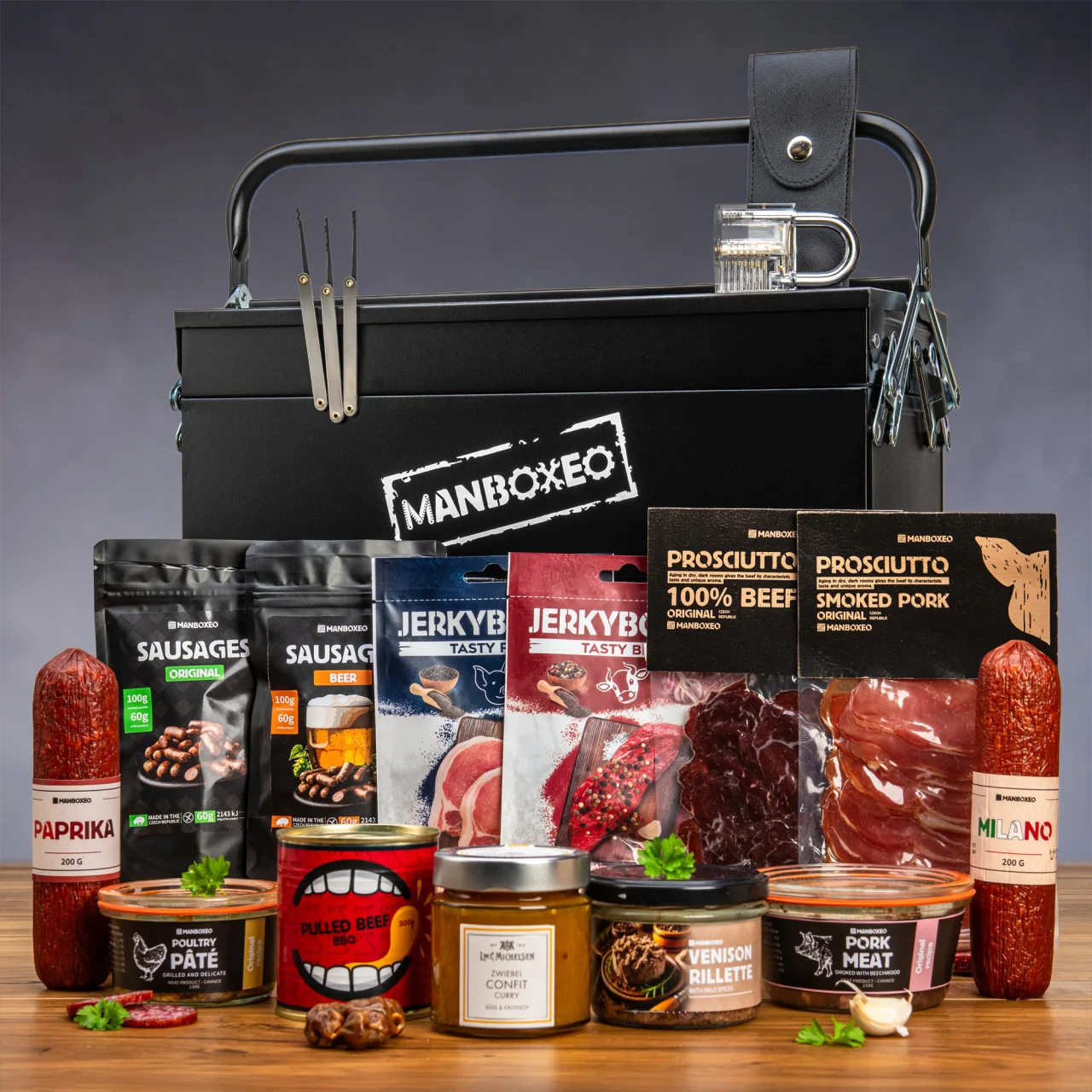 Mysleli ste si, že v tomto plecháči sa ukrýva len a len náradie? Omyl, dámy a páni. Ten, komu túto parádu darujete, nájde vo vnútri skutočný gurmánsky zážitok. Najrôznejšie pochúťky z mäsa, od paštéty, cez salámy až po pršut a jerky. Všetko dokonale poctivé, ako od maminky!