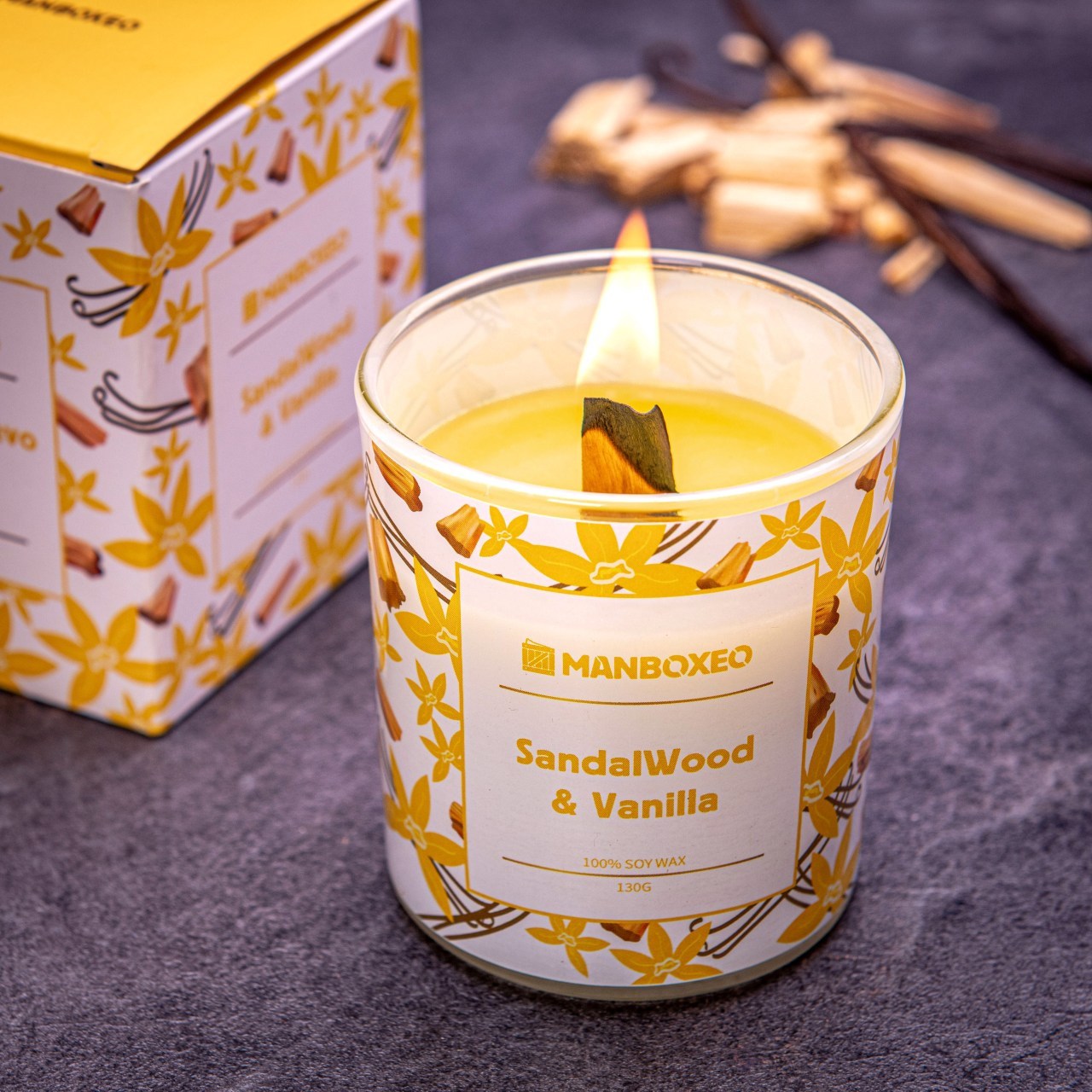 Luxusná voňavá sviečka 130 g – Santalové drevo & vanilka – No. 3 – Milujete šum praskajúceho ohňa, ale nemáte krb? Táto sójová sviečka ho hravo nahradí. Drevený knot pri horení vytvára upokojujúci praskavý zvuk. Sviečka nádherne vonia po santalovom dreve s vanilkou. Žiadne chemické „čary“, ale čisté kúzlo prírody. Doprajte túto relaxačnú atmosféru aj blízkym – kúpte sviečku ako darček.